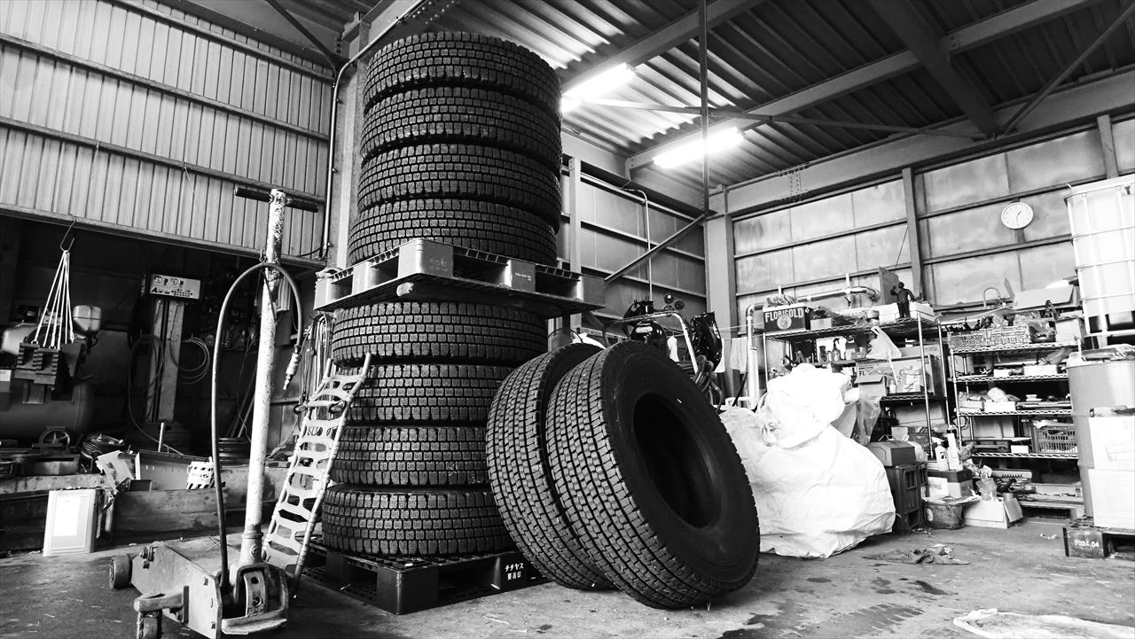 トラックの冬タイヤへの交換が進行中。